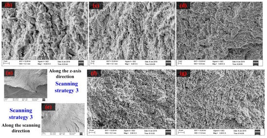 Crushing morphology of scanning strategy 3 specimens. (a) Specimen along the z-axis direction; (b–d) Enlarge images of (a); (e) Specimen parallel to scanning direction; (f,g) Enlarge images of (e).