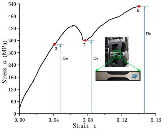 Figure 18 shows the tensile strength of the YCF104 specimen fabricated using scanning strategy 3. The tensile test was conducted to measure the tensile strength of YCF104 alloy powder. The metallurgical bonding direction and overlapping direction of the specimen under scanning strategy 3 are uniform and systematic. A uniform remelting mode improves the quality of metallurgical bonding and reduces internal defects. When the stress is lower than σe, it is proportional to the strain of the specimen, and the original shape can be restored when the stress disappears. In this case, the specimen is in the stage of elastic deformation, and the elastic limit is σe = 337.5 MPa. When the stress exceeds σe, the plastic deformation of the specimen occurs, and the stress disappears. Only part of the deformation can be restored, and the yield limit is σs = 358.71 MPa. When the stress of the specimen exceeds σs, it increases continuously with the increase of stress until it reaches the strength limit of the specimen and is broken, i.e., at this stage the tensile strength of the specimen is σb = 527.44 MPa. According to the fracture morphology based on compressive test and the tensile process, the specimen prepared using YCF104 powder should be brittle material.