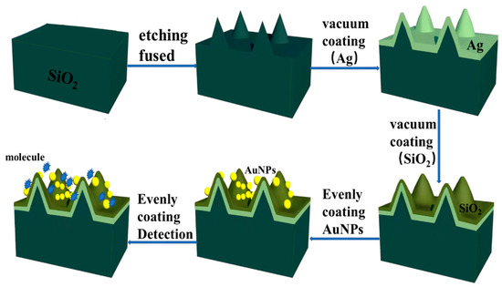 The preparation process of 3D multilayered plasmonic metamaterials is shown in Figure 1, which is mainly divided into three steps: (1) Nano-protrusion-textured-by-etching-fused silica substrate is obtained [37]. (2) The substrate is coated with 40 nm Ag and 15 nm SiO2 layers using a home-built thermal evaporation system. (3) Au-NPs are prepared and evenly rotated onto the substrate [38]. (4) The detection droplets are coated on the base and allowed to dry naturally for 30 h. The fused silica nano-protrusion-textured are obtained by fluorocarbon radical plasma etching on the stainless steel sample table of the RIE-3 system at an RF plasma frequency of 13.56 MHZ. Firstly, the chamber is cleaned with argon and oxygen plasma for 20 min and the fused silica substrate is put into the mixed solution (2:1 concentrated 65% HNO3 and 30% H2O2) for ultrasonic cleaning. Trifluoromethane (CHF3) and argon (Ar) plasmas are used in etching reactions, and the ratio of CHF3 to argon is 10:50 SCCM. When the power is kept at 600 W and the pressure in the cavity is 5 Pa, the fused silica is etched for 25 min. Finally, we use alcohol, acetone, and a mixed solution (2:1 concentrated 65% HNO3 and 30% H2O2) in turn to remove all of the impurities produced on the substrate during the etching process. The samples are coated with 40 nm thick of Ag and 15 nm thick of SiO2 using the Nanguang ZZS900 film coater (Rankuum Machinery Ltd., Chengdu, China). Before coating, the material is first cleaned with an ultrasonic wave and then cleaned again with an oxygen ion beam. It is plated successively with 2 nm chromium, 40 nm Ag, and 15 nm SiO2 film, where chromium film is an adhesive layer to enhance its structural robustness. The vacuum pressure is 5 × 10−4 Pa, and the evaporation rate is 5A/s. Finally, the Au NPs stock solution with a diameter of 5 nm is prepared by the hydrothermal method and dripped onto the prepared substrate.