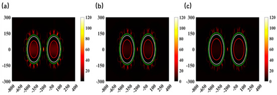 Figure 3. Electric field diagrams of nanostructures with different diameters. The thicknesses of Ag layer and SiO2 layers are constant, which are 40 nm and 15 nm, respectively. The red, white, and green lines are SiO2 column, Ag layer, and SiO2 interval layer, respectively. (a) 160 nm; (b) 180 nm; and (c) 200 nm.