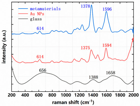 We compare our system performances with those of smooth glass substrate. This is the one way to prove that our approach is superior. As shown in the Figure 5, the R6G Raman peak on the smooth glass substrate does not have distinct characteristics, which may be the reason for the lack of enhancement effect. Another important reason may be the effect of fluorescence. Compared with the gold particle substrate on the glass substrate, the metamaterial substrate shows more distinct and strong Raman characteristic peaks. This is because 3D structures have a more uniform and robust spatial electromagnetic field (clearly shown in the electric field.), which can effectively enhance the Raman radiation.