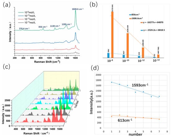 Figure 6. (a) SERS spectroscopy of Rh. B with different concentrations. (b) Intensity of Rh. B at 1606.6 cm−1 and 856 cm−1 as a function of different concentrations. (c) The characteristic spectra of 10−10 mol/L R6G solution are detected at the seven different points with seven measurements on 2 × 2 cm substrate (each measurement is separated by a week). (d) Intensity trend of R6G (10−10 mol/L) at 1593 cm−1 and 613 cm−1.
