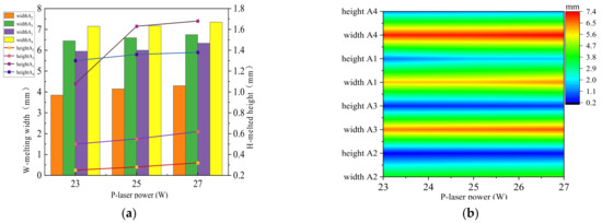 The laser power has a positive effect on the melting height. For the melting width, the peak value of the melting width appears at P = 25 w. When 25 w < P < 27 w, the melting width decreases. After the laser power and scanning speed reach the peak of the melting width, the reason for the decrease of the melting width is that the factors affecting the melting width are two-factor interaction, and the numerical distribution of the melting width is consistent with the distribution in Figure 14a,b.