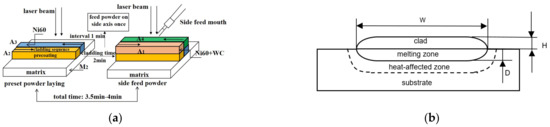 Cross section of the cladding layer: (a) schematic diagram of the cladding experimental process; and (b) the cross-section structure of cladding layer and matrix.