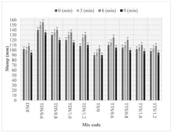 In this research, the amount of slump is measured and compared to the requirements for a particular application to ensure that the concrete has the right consistency to be placed and compacted properly. The influence of treated and untreated LWPA was assessed. In Figure 5, the age category of the fresh concrete specimens that can affect the slump value are presented. The slump value loss of the mixture for all samples is a widely used method to measure the consistency and workability of fresh concrete at 3, 6 and 9 min. The highest slump value of 155 mm was obtained for the TDS/0.6 mix, the minimum slump value of 90 mm was obtained for the TS/0 mix. For the mixes, good workability requires a longer time for the reaction between the cement and superplasticiser. It can be noted that the improvement of workability due to the lower pre-soaking w/c ratio is denser compared to the untreated shell. On other hand, the cohesion and bond strength between the pre-soaking shells that can enhance the workability of fresh concrete is expected to reduce friction compared to the untreated shell. The use of treated peach shell as a lightweight aggregate in concrete has shown promising results in reducing water absorption between 8% to 15% compared to the control specimen. This is due to the fact that the treatment process removes the organic matter and reduces the porosity of the shells, resulting in a denser and more durable aggregate [].