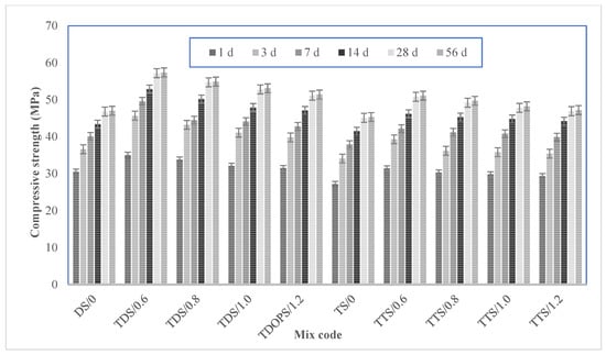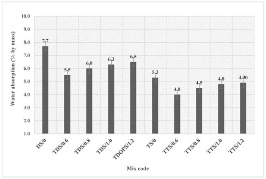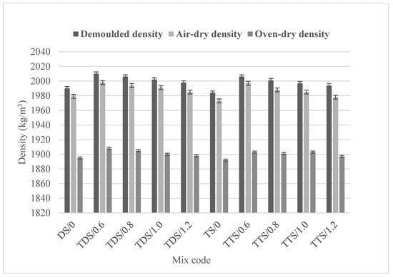Lightweight plant-based aggregate (LWPA) concrete can be categorized as a special type of concrete with a characteristic oven-dried density not more than 2000 kg/m3 [] Among the three types of density (DD: demoulded density, ADD: air-dry density, and ODD: oven-dry density), all specimens fell within the range of the lightweight concrete category, as presented in Figure 6. The oven-dry density and air-dry density of untreated shell mixes ranged between 1897–1908 kg/m3 and 1973–1998 kg/m3, respectively. From the DD results, it can be observed that 5 mixes (TTS/0.8, TTS/0.6, TDS/1.0, TDS/0.8 and TDS/0.6) slightly exceeded 2000 kg/m3. All mixes fulfilled the lightweight concrete requirements in accordance with the oven-dry density standard. From the results, the replacement of the untreated DS and TS with various ratios of the pre-soaking method on shell aggregates (TDS/0.6–1.2 and TTS/0.6–1.2) marginally increased the DD, ADD and ODD at about 7%, 10% and 12%, respectively. The increment in the density of lightweight concrete is due to a higher specify gravity with pre-soaking shell aggregates, especially for TDS/0.6 and/TTS/0.6. According to Mannan et al. [], it has been reported that treatment with polyvinyl alcohol also slightly enhanced the overall density of bio-based lightweight concrete.