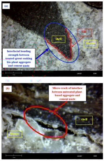 (a) Pre-treated grout soaking and (b) untreated interfacial bonding between the cement paste and shell aggregate.