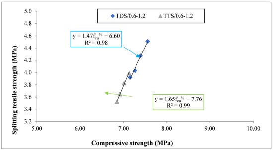 The linear correlations between the compressive strength and the split tensile strength test of pre-treated grout soaking with different w/c (0.6–1.2) formulations of dura and tenera shells at 28 days are presented in Figure 12. The fitting correlation coefficient (R2) for both treated dura and tenera reached up to 0.98 and 0.99, respectively. It indicated a consistent relationship between the compressive strength and the split tensile strength. Through the fitted equations, the splitting tensile strength of the treated LWPA concrete can be well predicted by its compressive strength. The following two equations are proposed for different types of treated shells (dura and tenera) to connect the Ft and the cube strength of LWPA concrete.