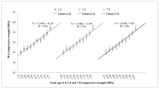 where, F1, F3 and F7 represent the cube compressive strength (MPa), and E1, E3 and E7 represent the early stage at 1 day, 3 days and 7 days of compressive strength, respectively.