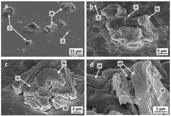 Impact morphologies of Ti2AlC MAX particles on 304 steel substrate after being cold sprayed under conditions of 5 MPa/1000 °C. SEM images with different magnifications (a–d). The inserts describe the following: i—adhesion of complete, flattened particles, ii—empty impact crater with ASI of steel substrate, iii—fractured particles, iv—secondary particle impacts, v—cracks, vi—deformation on laminae, and vii—viscous-like flow at laminae. Adapted with permission from Ref. []. Copyright 2020 Springer Nature.
