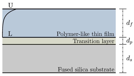The samples consist of LithosilQ1 fused silica substrates with a nominal thickness of 0.5 mm, onto which inhomogeneous polymer-like thin films were deposited. The substrate is assumed to be plan-parallel and isotropic with smooth boundaries. However, the harsh cleaning procedure necessary for adequate adhesion of the polymer-like thin film to the substrate resulted in the alteration of excitation states near the surface, necessitating the introduction of a thin transition layer into the structural model. The film itself is considered to be inhomogeneous but with smooth boundaries, and its inhomogeneity is mathematically described as a stack of homogeneous films with changing parameters. In this study, we divided the inhomogeneous film into 64 homogeneous layers.