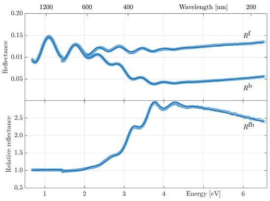 In the region of transparency, reflectance data exhibit small differences between measurements taken from the front and back sides with the dominant features corresponding to the substrate. To mitigate the influence of the substrate and enhance the sensitivity to the properties of the film, this set of data was extended with the values of relative reflectance. The relative reflectance, denoted by , represents the ratio between the front-side () and back-side () reflectances: