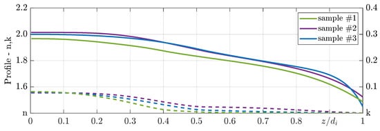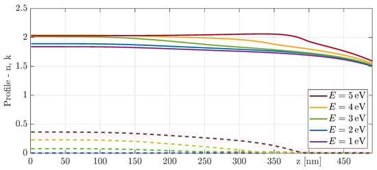 Comparison of the profiles of the optical constants for all the samples for the selected photon energy (). Solid lines depict the refractive index (left axis), dashed lines are extinction coefficients (right axis).