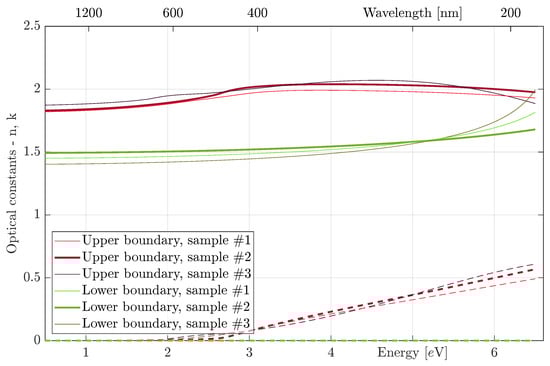 The dispersion parameters obtained for the inhomogeneous polymer-like thin film discussed in Section 4 and Section 5 are summarized in a tabular form in Table 4. Additionally, the table includes transition layer parameters. The optical constants of the inhomogeneous films are illustrated in Figure 6, which depicts the optical constants at the upper and lower boundaries. Moreover, Figure 7 displays detailed profiles of the optical properties at several photon energies.