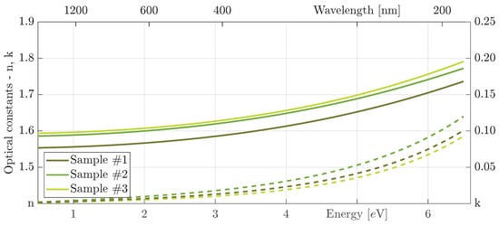 To ensure the reliability of the obtained results, all data for each sample, i.e., data from both ellipsometric and spectrophotometric measurements, were processed simultaneously using the least-squares method with our in-house developed newAD2 software [] for optical characterization. The contribution of individual datasets from different instruments with different systematic errors and spectral ranges to the residual sum of squares is not trivial to equalize in general, but newAD2 automatically accounts for these differences. By using this approach, the reliability of the results is improved.