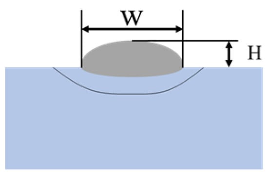 In order to observe the microstructure of the coatings and measure the width and height of the coatings, a 5 × 5 × 10 mm3 square specimen was cut out of the surface of a 45 steel shaft part using the wire-cutting method, and the surface was cleaned of stains using alcohol, inlaid, ground, and polished. The width and height of the molten layer were observed and measured using an optical display, and when measuring the height and width of the coating, each value was measured three times and then averaged. A schematic diagram of the coating width and height measurement is shown in Figure 1. W is the coating width, and H is the coating height. When the coating’s surface has the phenomenon of sticky powder, the powder particles were then excluded when measuring the coating’s width and height dimensions. When conducting the observation of the coating’s microstructure, a corrosion treatment was carried out using a 10% FeCl3 hydrochloric acid solution and a 4% HNO3 alcohol solution for 10 s each. After the corrosion treatment was completed, the microstructure was observed using either scanning electron microscopy or optical microscopy.