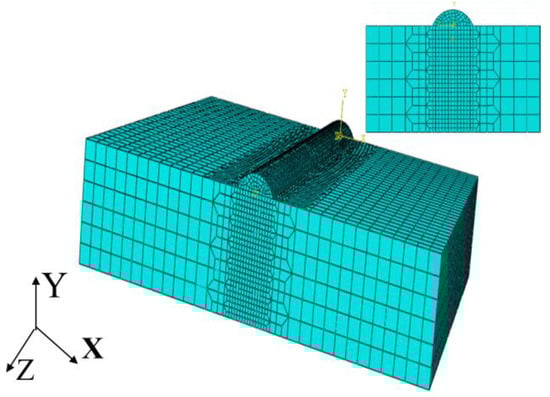 Abaqus software was used to create a geometric model based on the actual procedure of the 431 stainless steel coating on the surface of 45 steel shaft parts; the finite element model and mesh division are displayed in Figure 2; the substrate was sized at 10 mm × 10 mm × 3 mm, and the coatings had height and width parameters of 0.2 mm and 1 mm, respectively. The mesh was fine-tuned close to the coating layer, with a minimum mesh size of 0.05 mm, and coarsened further from the coating layer, with a maximum mesh size of 0.3 mm, to improve the computation accuracy and efficiency. Grids were numbered as 59,760, and the nodes added up to 252,367 in total. The DC3D8 hexahedral linear heat transfer cell was used for the temperature field computations, whereas the C3D8R hexahedral linear stress cell was used for the stress field calculations. Living and dead element technology was used in the model, and the coatings were already set in place. Coaxial powder feeding characteristics were more accurately simulated by progressively adding the coating to the heating calculation model as the heat source was shifted. To accomplish the goal of simultaneous material addition and heat source loading, the Fortran language was used to create a subroutine for the heat source, and “Model Change” was used to put the subroutine into action.