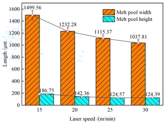 The coating’s single-channel cross-sectional size, and melting rate were investigated in the research shown in Figure 4; the powder feeding rate was held unchanged at 20.32 g/min, and the laser power was set at 2400 W. Figure 4 shows that when the laser cladding speed was raised from 15 to 30 m/min, both the width and height of the coating dropped. The reduction in width was 33.4%, and the fall in height was 30.8%, respectively. Powder particles and substrates spent less time under the laser’s irradiation when the laser cladding speed was increased, resulting in less energy being absorbed per unit time of the material, less material being melted, and the molten pool becoming unstable, thereby resulting in a reduction in both the breadth and height [26].