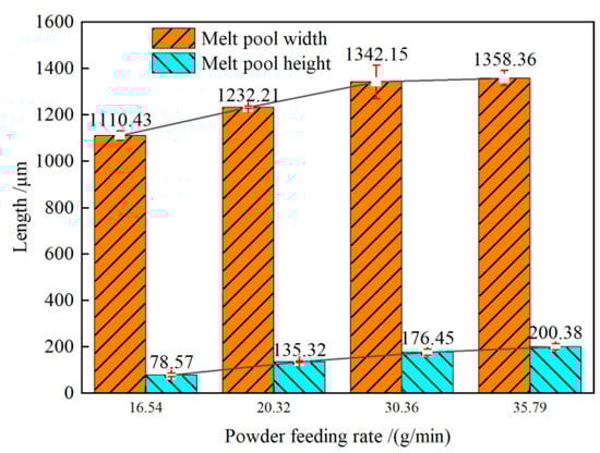 As shown in Figure 5, the effect of the powder feed rate on the coating section size was investigated while maintaining a constant laser power of 2400 W, and a laser cladding speed of 20 m/min. Figure 5 demonstrates that the cladding layer grows in both height and breadth when the powder feed rate was increased. When the powder feed rate was raised from 16.54 g/min to 35.79 g/min, the coating grew in width by 22.34%, and in height by 155.03%, respectively. This was due to the higher powder feed rate, more material and laser energy being delivered into the melt pool, and a large increase in coating height and width [27].