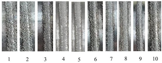 Figure 6 shows the unpolished surface state of the melted coating, which must be considered when choosing the process parameters for the laser cladding process in the numerical simulation analysis. Samples 1 to 10 of Figure 6 correspond to experimental serial numbers 1 to 10 in Table 2, respectively. Samples No. 1 and No. 2 had many unmelted powder particles present at the edges of the coatings due to the low laser power, which led to an insufficient melting of the powder particles, and failed to form a stable melt pool; sample No. 3 was able to form a temperature melt pool, but the coatings had a serious sticky powder phenomenon; samples Nos. 4 and No. 5 had a good surface condition; samples Nos. 6, No. 7, and No. 8 were able to form a melt pool; there was a great deal of unmelted powder on the top of Nos. 9 and No. 10. So, sample No. 4’s process parameters were chosen for the numerical simulation study after considering the influence of the laser cladding speed and the laser power on the size of the melting section, and the results of the surface condition analysis.