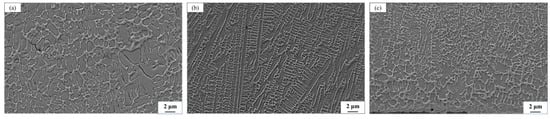 Figure 11 depicts the microstructure of the top, middle, and bottom of a single cross-section of the ultra-high-speed laser cladding coatings. Small, flat crystals formed near the metallurgical bond between the substrate and the coatings at the coating’s bottom, while large, dendritic crystals grew vertically along the bonding surface in a relatively uniform fashion, indicating that the temperature gradient was greatest in this region, making it suitable for crystallization and tissue development. There were smaller dendritic crystals found with a fine slatted structure and a reasonably consistent growth direction observed in the cladding layer’s middle region, parallel to the heat dissipation axis. The coating’s top section displayed both fine dendritic and equiaxed crystals, with the dendrites being noticeably larger than those in the coating’s bottom and middle regions.