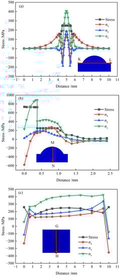 Residual stress on different paths of the coating. (a) Path KL; (b) path MN; and (c) path GH.