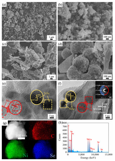 Figure 2a,b display the SEM of the Ni/graphene composites. It can be seen that due to the reduction of the NaH2PO2 and the action of the anionic surfactant, C12H25SO3Na, 50-nm metallic nickel particles were firmly attached to a sleek graphene surface through anchoring. Although the complexing agent, C6H5Na3O7, can enhance the dispersion of metallic nickel, it can still be seen that part of the metallic nickel was agglomerated on the graphene surface. This phenomenon limited the charge-transport efficiency. When the sample was selenized at a high temperature, the nickel layer of graphene gradually transformed into NiSe, which wrapped around the metallic nickel to form a NiSe@Ni. As shown in Figure 2c,d, when the Ni/graphene was selenized by the chemical-vapor deposition, the metal nickel on the graphene surface had obvious agglomeration before selenization, but the agglomeration was obviously weakened after the selenization. The NiSe nanoparticles with rough surfaces and an average diameter of 180–210 nm were uniformly immobilized onto the surface of the graphene, thereby forming a NiSe@Ni/graphene composite material. The anisotropic growth of the NiSe@Ni/graphene increased the particle size and surface area, leading to more active sites. The nucleation of the NiSe particles uniformly dispersed on the graphene surface provided an excellent interface structure and improved the electron-transfer efficiency. A strong explanation was therefore provided for the enhanced electrochemical performance. It can be seen from the HRTEM images (Figure 2c,d) that the surfaces of the graphene sheets were roughened by the immobilization of a substantial quantity of NiSe particles onto them. The lattice fringes with interlayer distances of 0.27 and 0.2 nm in the HRTEM (Figure 2c) correspond to the (101) and (001) planes of the NiSe particles. The corresponding SAED pattern (Figure 2d) presented discrete diffraction spots, representing multiple facets of the NiSe structure, including (101), (102), (110), and the cubic Ni (111) plane (PDF # 04-0850). The distribution of the elements in the sample is shown in Figure 2e. The Ni (green), C (red), and Se (blue) elements were uniformly distributed on the graphene. The EDS shows that the NiSe@Ni/graphene was composed of C, Ni, and Se elements. The observed O and Cu elements were derived from air mixed in the sample preparation and the copper column used in the test sample, respectively [27]. Section 2.4 provides the explanation for the use of excess selenium powder in the samples’ preparation. To synthesize the NiSe, only 100 mg of selenium powder was used, despite the requirement of 400 mg for chemical-vapor deposition. This resulted in a different Se-content ratio from that which we expected based on the SEM mapping. In fact, the actual ratio was closer to Mgraphene:MNi:MSe = 2:3:3.