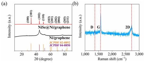 The X-ray diffraction results (Figure 3a) show that the diffraction peaks of the NiSe@Ni/graphene can be accurately identified as originating from the NiSe (JCPDF # 02-0892) and the face-centered cubic Ni (JCPDF # 04-0850). The XRD pattern showed characteristic peaks of Ni/graphene at 44.5°, 51.8°, and 76.4°, which corresponded to the (111), (200), and (220) planes of the face-centered cubic Ni. These results suggest that the Ni coating exhibited exceptional crystalline properties [24]. After the selenization of the Ni/graphene samples, we can see that the (100), (101), (102), (110), (103), (201), (202), (004), (203), and (211) corresponded well to the characteristic peaks of the NiSe without excrescent impurity peaks, which suggests that the high-purity nickel-selenide crystals were distributed across the surfaces of the graphene sheets. The crystallite sizes of the Ni/graphene and NiSe@Ni/graphene were calculated using the Debye–Scherrer formula [28], and they were found to be 11.8 nm and 75.0 nm, respectively. The Raman spectrum of the NiSe@Ni/graphene is shown in Figure 3b. The classical D, G, and 2D peaks of the graphene appeared at 1300, 1580, and 2700 cm−1. The Raman image of the NiSe@Ni/graphene was used to analyze the state of the graphene after the recombination (Figure 3b). As the D band was derived from the vibration of the sp3 hybridized carbon atoms present in the disordered domains and defect regions [24], the intensity ratio of the D band to the G band at a high temperature of 700 °C, which was 0.1, indicated the presence of a higher number of defects in the composite sample. This can be advantageous in terms of exposing more active sites and accelerating mass transport during the electrochemical process. In contrast to the single-layer graphene, in which the 2D peak had a single peak form as it was formed by the direct intersection of two equal-energy-band electrons, the 2D peak in the multilayer graphene was a result of the interaction between the layers. As the number of layers increased, the interaction between the layers weakened, resulting in a decrease in the intensity of the 2D peak. Based on these findings, the 2D peak in the single-layer graphene in this study was expected to be more pronounced.