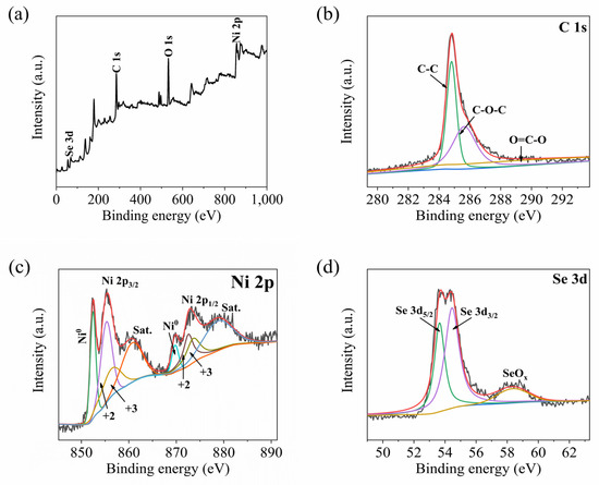 The surface-element compositions and chemical states of the NiSe@Ni/graphene composite were analyzed using XPS, as depicted in Figure 4. Based on the survey spectrum of the XPS (Figure 4a), the primary components of the NiSe@Ni/graphene composites were found to be C, Se, and Ni elements. The O 1s peak observed in the spectrum was attributed to contamination resulting from the exposure of the sample to ambient air [29,30]. Figure 4b displays the C 1s spectra that were separated into three distinct peaks, with binding energies of 284.8 eV, 285.5 eV, and 286.7 eV, which corresponded to the C-C, C-O-C, and O=C-O bonds, respectively [31]. The XPS spectrum of the Ni 2p in Figure 4c indicates the presence of Ni 2p3/2 and Ni 2p1/2, as well as their associated satellite peaks [32]. The weak peaks observed at 856.4 eV and 873.7 eV were identified as the Ni3+ the in Ni3Se4, while the sharp peaks at 855.3 eV and 872.6 eV were identified as the Ni2+ in the NiSe. Furthermore, the intense peaks at 861.1 eV and 878.8 eV were observed as shakeup satellites for the Ni 2p3/2 and Ni 2p1/2 levels (represented as “Sat.” in the spectrum) [33]. Notably, the characteristic peaks observed at 852.5 eV and 869.8 eV originated in the metallic nickel, which provides solid evidence for metallic nickel as an effective medium for ion transport between graphene and NiSe. The peaks deconvoluted at binding energies of 53.61 eV and 54.47 eV can be attributed to the Se 3d5/2 and Se 3d3/2 spin-orbit levels of the Se-Ni in the NiSe, respectively. This suggests that chemical bonding occurred between the NiSe particles and the graphene sheets with large surface areas [34]. The peaks centered at 58.4 eV represent the related oxides of the Se [35].