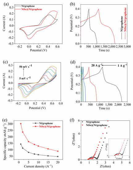 We tested the electrochemical performance of the NiSe@Ni/graphene and Ni/graphene in a three-electrode configuration, with KOH as an electrolyte. Figure 5a,c show the CV curves of the NiSe@Ni/graphene and Ni/graphene at the same scan speed (50 mV s−1) and different scan speeds (5–50 mV s−1). Based on the observations in Figure 5a, it can be concluded that the integral area of the CV curve showed an increase within the voltage range of −0.2–0.6 V for the NiSe@Ni/graphene composite, and that the peak current of this composite was larger than that of the pristine Ni/graphene with similar mass. These findings indicate that the hybrid electrode of the NiSe@Ni/graphene composite exhibited a greater charging-storage capacity and higher specific capacitance. Furthermore, the NiSe@Ni/graphene hybrid electrode displayed almost no shift in the reduction in the potential peak compared to the pristine NiSe electrode. A slight shift was observed in the oxidation-potential peak, but it was very minor. This can be attributed to the fact that the NiSe@Ni/graphene hybrid electrode had a lower internal resistance, resulting in a more reversible redox reaction. The results obtained from the GCD measurements at a current density of 1 A g−1 (Figure 5b) support this conclusion, and the larger capacity area obtained from the GCD curve was consistent with the results obtained from the CV curve. Finally, Figure 5c shows the CV curves of the NiSe@Ni/graphene composite in a potential window of −0.2–0.6 V for scanning rates in the range of 10–50 mV s−1. The apparent reduction and oxidation reactions observed in the CV image suggest that the conversion of the nickel ions between the different oxidation states can be attributed to the faradic reaction [24,33,36]. The electron-transfer-construction processes were: