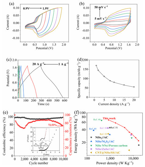 Electrochemical investigations were performed on an asymmetric supercapacitor device, specifically NiSe@Ni/graphene∥AC, so as to explore the practical applications of the NiSe@Ni/graphene. The electrochemical parameters of the AC electrode are shown in Figure S1 for comparison. The CV graphics of the optimized device were obtained in unequal potential windows, ranging from 0.0–0.9 V to 0.0–1.9 V, revealing distinct anodic and cathodic peaks within the tested voltage range. The redox reaction was sustained even when the operating voltage was raised to 1.7 V. These results demonstrate the practical utility of NiSe@Ni/graphene in this type of device. Figure 7a provides a visual representation of the CV curves. When the voltage continued to rise, the CV curve was obviously deformed, indicating an irreversible reaction [44]. The electrochemical performance of the NiSe@Ni/graphene∥AC device remained stable within a potential range of up to 1.6 V. This was demonstrated by the typical CV curves of the device, shown in Figure 7b, which were obtained at scan rates ranging from 5 mV s−1 to 50 mV s−1. Therefore, the NiSe@Ni/graphene∥AC ACS device can operate in a potential window of up to 1.6 V for stable electrochemical performance. No obvious distortion was observed in the shapes of the CV curves, even at higher scan rates, indicating that the ASC device had a good transient-current response and capacitive performance [45]. Figure 7c displays the discharge curves, which illustrate the ASC’s discharge performance as the current density gradually increased. The GCD curves obtained at diverse densities of current, from 1 to 20 A g−1, exhibited remarkable electrochemical reversibility, as evidenced by their excellent symmetry. Based on the GCD curves obtained at various current densities (as shown in Figure 7d), the device was found to exhibit a specific capacitance of up to 170 F g−1 at a current density of 1 A g−1. Interestingly, even at a significantly higher current density of 20 A g−1, the specific capacitance was observed to remain constant at 55 F g−1. Figure 7e shows that the device’s charge–discharge rate and power density can be improved, as the values obtained of electrochemical impedance spectroscopy (EIS) at the open circuit potential with an amplitude of 10 mV for the Rs and the Rct of the NiSe@Ni/graphene∥AC were 1.41 and 0.85 Ω, respectively, which were considered favorable. When the NiSe@Ni/graphene∥AC device was detected at 10,000 charge–discharge cycles at a current density of 10 A g−1, the coulombic efficiency consistently remained above 98%, as shown in Figure 7e. However, the capacitance initially decreased significantly in the early cycles due to the loss of electrode capacity resulting from the electrolyte decomposition and the formation of an irreversible SEI layer [46]. After 2000 cycles, the specific capacity of the NiSe@Ni/graphene electrode gradually increased. The device exhibited excellent long-term cycle stability, with a capacitance retention of 72.53% even after 10,000 cycles. The increase in specific capacity was primarily due to the reversible formation of a gel-like protective layer by the nanoparticles on the surface of the NiSe@Ni/graphene electrode, which exhibited “pseudocapacitive behavior”, which is commonly found in electrodes composed of graphene/transition-metal compounds [47]. These test results demonstrate that the NiSe@Ni/graphene∥AC supercapacitor has good charge–discharge and cycle performance, and that it is an excellent energy-storage device. Figure 7f displays the Ragone plot of the device’s energy density and power density. The results show that the NiSe@Ni/graphene//AC asymmetric supercapacitor outperforms similar metal-selenide energy-storage devices [48,49,50,51,52], with a high energy density of 68 Wh kg−1 at a power density of 853 W kg−1 and an energy density of 22 Wh kg−1 at a power density of 16,737 W kg−1.