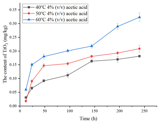 The migration of TiO2 in 4% (v/v) acetic acid at 40, 50, and 60 °C.