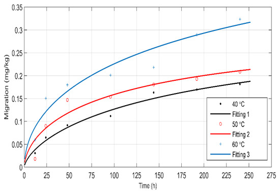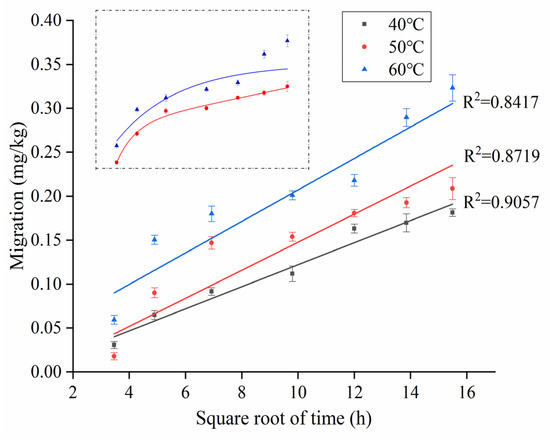 The crank theory shows that the migration behavior of chemical substances in packaging materials is linear with the square root of the migration time; therefore, the migration behavior is in agreement with the Fick law of diffusion [27]. Based on the diffusion process, the migration data fitting of TiO2 in 4% (v/v) acetic acid is presented in Figure 2. The R2 value of migration kinetics occurring at 40 °C was 0.90571 and R2 values at 50 and 60 °C were less than 0.9, indicating that the migration of TiO2 was not suitable to the Fick law of diffusion.