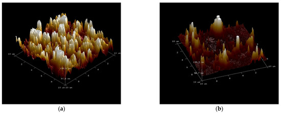 The results of the Fick law of diffusion show that the migration of TiO2 does not follow the diffusion; therefore, there may be other types of Ti. AFM images present the three-dimensional topography change in the film. As shown in Figure 4, the bright protruding parts are TiO2 particles present in the composite [23]. Prior to the migration (Figure 4a), TiO2 particles are uniformly distributed in the film. Following the migration (Figure 4b), the bright parts reduce and distribute unevenly. TiO2 particles evidently reduce in number at the vertical height. This suggests that TiO2 migration does not only occur on the surface of the film, but also migrates from inside the polymer matrix. At the same time, a reduction in the dark parts also illustrates the evidence of matrix degradation.