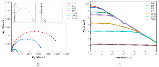 Figure 8 presents the impedance spectrum of food cans immersed in a 4% (v/v) acetic acid solution for 240 h. Within 12 h of the initial soaking period of the food cans, the Nyquist spectra presented a circular arc with a large curvature, the Bode spectra presented a straight line with a slope of −1, and the low-frequency impedance modulus |Z0.01 Hz| was 1.64 × 1010. With the prolongation of the immersion time, the corrosive medium penetrated the composite film layer through microporous defects present on the surface, resulting in a continuous decrease in the radius of the capacitive arc, a gradual decrease in the low-frequency impedance value, and a plateau in the low-frequency region of the Bode spectra. After soaking in the 4% (v/v) acetic acid solution for 96 h, the Nyquist spectra presented a second capacitive arc. During this stage, the acetic acid and water molecules passed through the film and entered the metal substrate [34], and surface electrochemical reactions occurred.