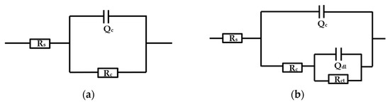 Equivalent electrical circuits for the coatings at different stages of immersion: (a) Stage one; (b) Stage two.