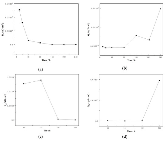Variations in the fitting impedance parameters with immersion time: (a) coating resistance Rc; (b) interfacial capacitance Qc; (c) charge transfer resistance Rct; and (d) double-layer capacitance Qdl.
