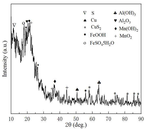 In order to further analyze the performance changes in the composite film, the composite film that was soaked for 240 h was peeled off the substrate and analyzed by the XRD method. The obtained spectrum is present in Figure 12. It can be observed that the composite film contains various metal oxides, indicating that corrosion occurred under the film and the corrosion products migrated to the composite film. The corrosion that occurred under the membrane of the composite film explains the reason for the protrusion of the polyester layer and its separation from the substrate following its immersion in the acetic acid solution. This process is related to the acidic corrosion mechanism of metals. On the one hand, after acetic acid enters the metal substrate, the electrochemical corrosion of hydrogen evolution occurs, and the generation of hydrogen gas supports the composite film, thereby weakening the bonding strength between the substrate and composite film [37]. On the other hand, the generation of corrosion products continuously occupies the gap between the polymer film and substrate, thereby exacerbating the separation between the composite film and substrate. The blackening of the composite film may be related to the formation of black corrosion products CuS2, MnO2, and Fe2SO4.