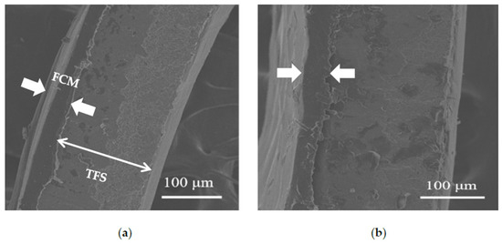 Through the SEM analysis of the cross-section structure of the food cans prior to and following the migration process, we observed that the total thickness of the cross-section prior to migration was approximately 200 μm. The FCM’s layer thickness was approximately 20 μm (FCM is the food contact layer inside the can) and the TFS’s layer thickness was approximately 160 μm. The outer film’s thickness was approximately 15 μm. The cross-section was smooth and the connection between the layers was strong (Figure 13a). Following the migration of the 4% (v/v) acetic acid solution, the presence of corroded products caused the separation of the FCM and TFS layers, and the cross-section became rough (Figure 13b). This result shows that acidic environments reduce the barrier’s ability to composite membranes, because acetic acid and water molecules pass through the composite film and enter the passivation layer (Cr2O3 layer). Under acidic conditions, the passivation layer gradually dissolves and generates H2, causing the composite film to bulge [38]. When the passivation layer is dissolved and perforated, both H2O and H+ chemically react with the substrate metal, accelerating the separation process of the composite film from the substrate, leading to the failure of the barrier’s performance in the composite film (as presented by the following formula):