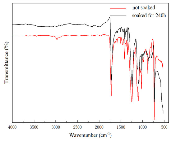 The structural changes occurring in the composite membrane prior to and after migration in the 4% acetic acid solution for polymer-laminated steel cans were studied by IR-ATR. The characteristic bands of chemical groups in the composite membrane can be clearly observed in Figure 14. The value of 2960 cm−1 is an asymmetric -CH3 stretching vibration peak, and 1712 cm−1 has a conjugated effect of the benzene ring, which is a C=O (C=O-OH) stretching vibration peak [39]. The C=C stretching vibration absorption peaks in the benzene ring are located at 1578, 1505, and 1449 cm−1. The C-O asymmetric stretching vibration absorption peak is located at 1239 cm−1 [40]. The C-H in-plane bending vibration absorption peak of the benzene ring is located at 1016 cm−1, the C-H in-plane bending vibration absorption peak of the benzene ring is located at 871 and 722 cm−1, and the bending vibration band of the Ti O-C bond is located in the 1242–1016 cm−1 region [41]. The characteristic bands of the TiO2 rutile group appeared to be approximately 640, 530, 400, and 340 cm−1. Since the ATR test wavelength started from a value of 520 cm−1, it could not be observed at a length shorter than 400 cm−1; however, the characteristic absorption peak of rutile TiO2 can be observed at 632 and 538 cm−1 of the composite membrane.