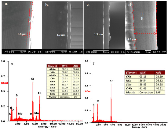 Figure 1a–d show the cross sections of the coatings. It is clearly observed that the thickness of the CrSiN coating increases significantly from 0.8 to 4.0 μm. The thicknesses are 0.8 μm (T1), 1.2 μm (T2), 1.9 μm (T3), and 4.0 μm (T4), respectively. Each interface is well bonded and uniform in thickness, without obvious defects. Moreover, Figure 1a–d show that the CrSiN coating is well-compact, with a relatively flat cross section, no columnar crystal structure, and that each deposited layer is well-bonded to the other without significant pores, leading to its strong resistance to crack expansion. The addition of Si can refine the columnar crystal structure of the coating and improve the compactness of the coating. Figure 1a–d demonstrate that the coating structure becomes compact as the thickness increases. The compact structure is able to avoid the abrupt sinking of the tip during indentation testing, resulting in high hardness. In addition, elemental analysis of point A on the surface of the T1 coating reveals the presence of Fe, Mo, and V, originating from the W18Cr4V substrate, due to the thin thickness of the T1 sample. In addition, C and O are detected on the surface of the T4 coating due to surface contamination. Excluding the effects of surface contamination and matrix elements, we can say that the thickness has little influence on the element content in the coating, and the main components of the coating are Cr, Si, and N.