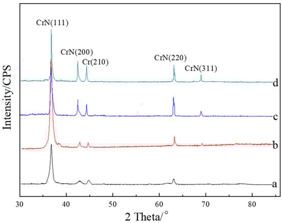 At present, the development of high-speed cutting and dry cutting technology puts forward higher requirements for tool materials and cutting performance, and the cutting tools which are covered by coatings exhibit an important way to improve their surface properties by endowing them with higher hardness and wear resistance [,,,]. In addition to fabrication techniques and methods, the type and structure of the coating is a significant factor in the lifetime of the cutting tools. In the past decades, the tools coated with a transition metal nitride coating, such as TiN [,,], CrN [], NbN [], and ZrN [], demonstrated that they were well resistant to wear. They combine the advantages of high strength and toughness of the steel matrix and high hardness and wear resistance of the coating not only to enable high-speed cutting of tools but also to enhance machining accuracy and quality of the workpiece. Particularly, CrN coatings are expected to be technologically important in many tribocorrosion-resistant applications due to their good wear resistance, corrosion resistance, and oxidation resistance [].