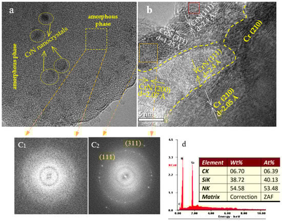 Figure 4 shows the TEM images of the T4 and T1 coatings. It is clearly observed that the structure of the T4 coating is a mixed structure consisting of tiny CrN nanocrystalline and amorphous phases, combining with the XRD pattern, and we know that the CrN nanocrystal is mainly in the (111) index. The selected area electronic diffraction (SAED) in Figure 4c1 (yellow box area in Figure 4a) demonstrates that the T4 sample formed a large mount of amorphous phases. In contrast, the T1 coating shows a distinct interface consisting of a Cr base layer, a CrN interlayer, and a CrSiN top layer. The Cr layer has the (210) crystal plane with a d-spacing of 2.05 Å, the CrN interlayer shows two indexes of (111) and (200) with d-spacing of 2.4 Å and 2.07 Å, and the CrSiN top layer exhibits d-spaces of 1.25 Å and 2.4 Å, corresponding to the (311) and (111) plane indexes. The SAED image in Figure 4c2 demonstrates the formation of a CrN polycrystalline phase. Following the EDS analysis in the red box region in Figure 4b, we know that this region is dominated by Si and N elements, 40.13 at% and 53.48 at%, respectively, close to 3:4. From this, we deduce that the amorphous phase is Si3N4 and that the structure of the T1 coating is a mixture of CrN polycrystalline and Si3N4 amorphous phases. Figure 4 demonstrates that as the coating thickness increases, the crystallinity of the coating and the size of the grains decrease significantly, which is in strong agreement with the XRD results.
