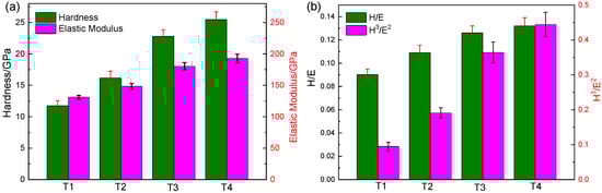In addition, the ratios H/E and H3/E2 are two important factors to assess the mechanical properties of the sample, as shown in Table 2 and Figure 5b. The T4 coating exhibits the highest H/E and H3/E2 ratio of all the coatings, and the corresponding values are 0.132 and 0.444, respectively. However, the T1 coating exhibits the lowest H/E and H3/E2 ratios among all the coatings, namely 0.09 and 0.095. Table 2 and Figure 5 suggest that the H/E and H3/E2 values increase with increasing coating thickness. Therefore, it also indicates that an increased coating thickness results in better mechanical properties.