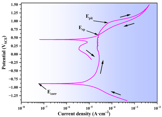 Figure 6 displays the cyclic polarization curve of Fe48Cr15Mo14C15B6Y2 amorphous coating in borate buffer solution with pH = 7.0. The as-sprayed amorphous coating exhibits a typical response behavior featured by a large range of passivation (−0.5–1.0 VSCE) and a small hysteresis loop extending from approximately 0.58 VSCE (repassivation potential Erp) to 1.50 VSCE. The small area of hysteresis loop for the amorphous coating shows that the pitting resistance is relatively high [34]. Moreover, the transformation of current density in the reversed direction existent in the cyclic polarization curve is thoroughly associated with the steadiness of passive film [35]. In the anodic direction from −0.5 VSCE to 1.0 VSCE, the amorphous coating exhibits a passive state. Therefore, 0.8 VSCE was selected as the formation potential for potentiostatic polarization measurement in this passivation zone. It is shown that the current density across the passive zone is on the order of 10−4 A·cm−2 magnitude with no noticeable transient current peak owing to redox reactions [36]. In this regard, the passivated coating surface can retain an unchanged state allowing for the indefinite growth of passive film in a short period. Additionally, it is possible to keep up the prevention of capacitance reduction for Mott–Schottky curve measurement. The current density is boosted dramatically once the potential exceeds the breakdown potential (about 1.0 VSCE), which can be intimately affiliated with a slow dissolution of Cr-containing species at a transpassive region or rupture of passive film and the oxygen-involved redox reaction on the coating surface [37].