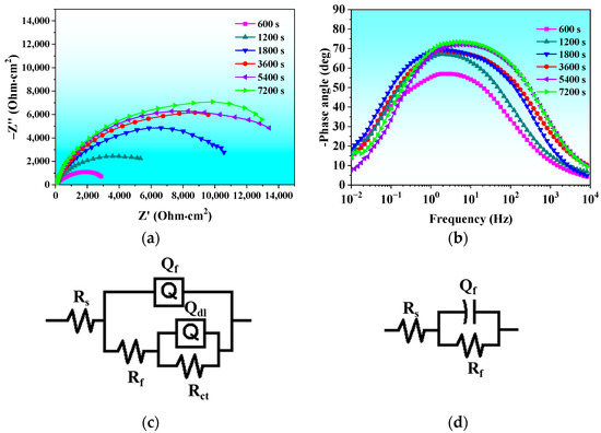 The equivalent electric circuit Rs(Qf(Rf(QdlRct))) in Figure 7c is deployed to fit the impedance results for the coating passivated for 600s. Rs, Qf and Rf in this simulation model denote electrolyte resistance, film capacitance and film resistance, separately. Qdl and Rct indicate the double-layer capacitance and the charge transfer resistance between the coating and substrate, respectively. Comparatively, the equivalent electric circuit Rs(QfRf) in Figure 7d is executed to simulate the impedance spectra data for the coating passivated for 1200, 1800, 3600, 5400 and 7200 s.