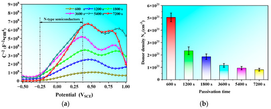 To further estimate the electrochemical properties between passive film and electrolyte during passivation, Mott–Schottky curves were recorded in Figure 8a. It is presumed that the double-layer capacitance C is functional to the external potential E of n-type semiconductors as revealed in the following equation [40,41,42]: