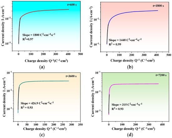 Based on Equation (3), the current density log is consequently positively correlated with Q−1, and Figure 9 shows the simulated results of log I plotted against Q−1 of passive films passivated across a range of durations. It is obvious that log I and Q−1 conform to a linear relationship, which is compatible with the high electric field model hypothesis [45]. It is reported that the slope value cBV can reflect the self-repairing of the film and the smaller the slope is, the stronger ability of self-repairing is [47]. In the linear region, the slope values are determined as follows: 1800 (t = 600 s) − 1440 (t = 1800 s) − 426.9 (t = 3600 s) − 315 (t = 7200 s) C2·cm − 4·s−1. Thus, a longer passivation time is shown to improve the self-repairing progression of passive film.