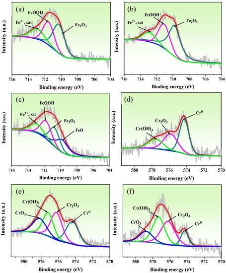 Fitting results about XPS spectra of passive films corresponding to Fe48Cr15Mo14C15B6Y2 amorphous coating under different passivation times: (a) Fe 2p3/2, 1800 s; (b) Fe 2p3/2, 3600 s; (c) Fe 2p3/2, 7200 s; (d) Cr2p3/2, 1800 s; (e) Cr2p3/2, 3600 s; (f) Cr2p3/2, 7200 s.