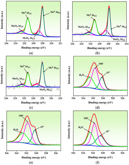 Fitting results about XPS spectra of passive films corresponding to Fe48Cr15Mo14C15B6Y2 amorphous coating under different passivation times: (a) Mo 3d, 1800 s; (b) Mo 3d, 3600 s; (c) Mo 3d, 7200 s; (d) O 1s, 1800 s; (e) O 1s, 3600 s; (f) O 1s, 7200 s.